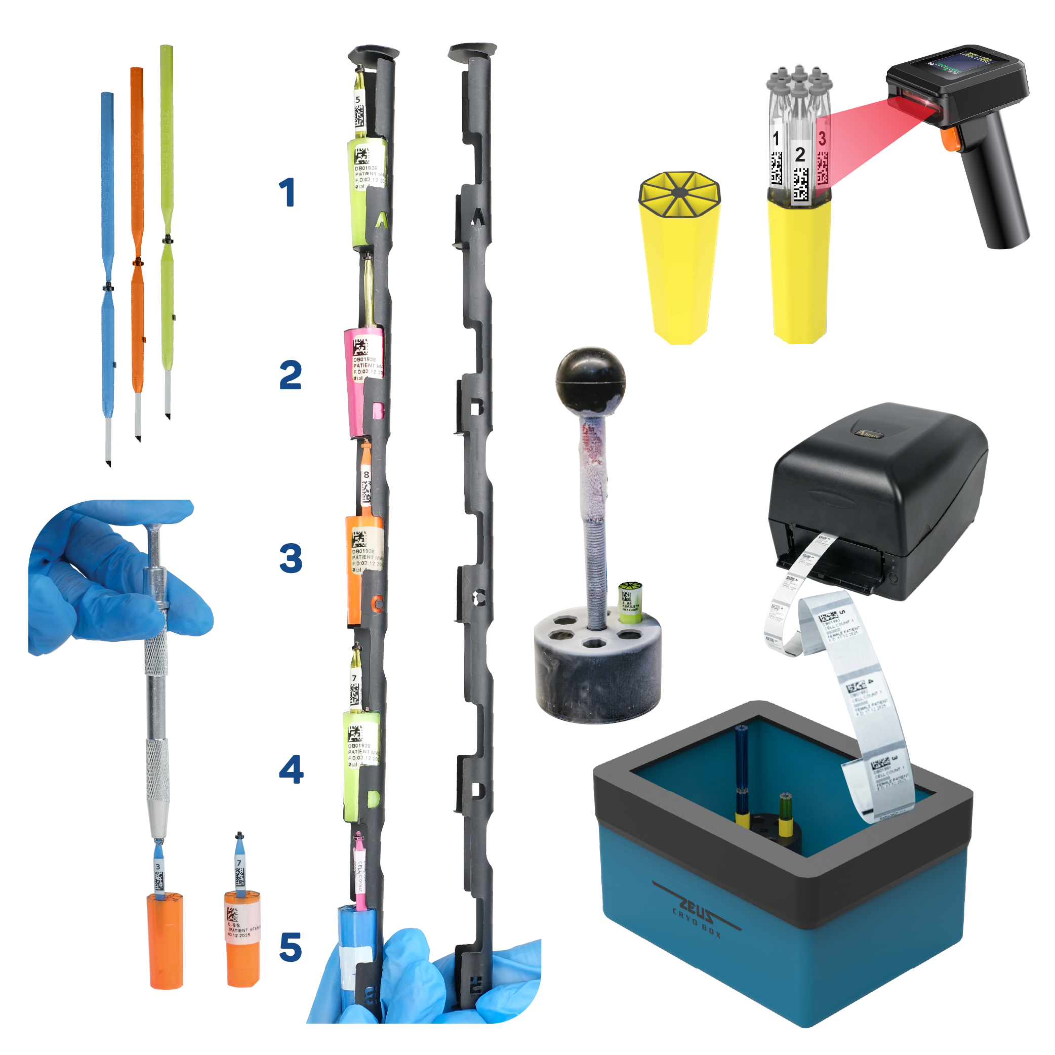 The Zeus Smart Cryo-Tools system is an integrated set of intelligently designed tools developed to improve safety, traceability, and workflow efficiency during the cryopreservation and storage of embryos and oocytes. By utilizing patented shortenable Smart Straws, the system can quadruple the storage capacity of existing liquid nitrogen tanks without requiring new hardware. The octagonal goblet design ensures that samples remain submerged in nitrogen during handling, maintaining a continuous cryogenic chain and protecting delicate biological materials from thermal shock. To ensure maximum safety and error-free identification, the system utilizes specialized liquid nitrogen-resistant barcodes that remain durable and readable even while submerged in nitrogen. This integration provides full in-tank addressing and library location indexing, enabling the system to track the exact tank, canister, cane, goblet, and straw location of every sample. Consequently, for the thawing process, users can utilize the wireless barcode reader to pinpoint and verify sample locations in real time without the need to remove them from the nitrogen, ensuring the correct embryo or oocyte is selected before every procedure.