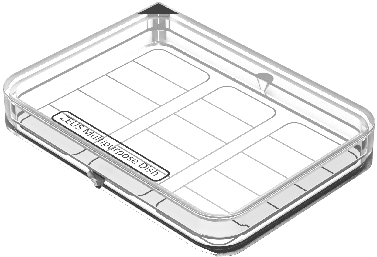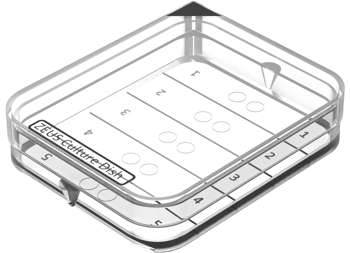 Versatile 5-lane, 3-column structured layout for ICSI and routine IVF manipulations, allowing for continuous lane-based tracking.